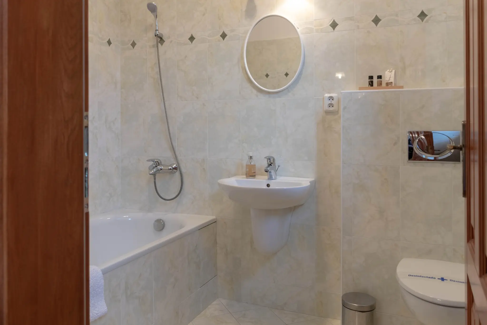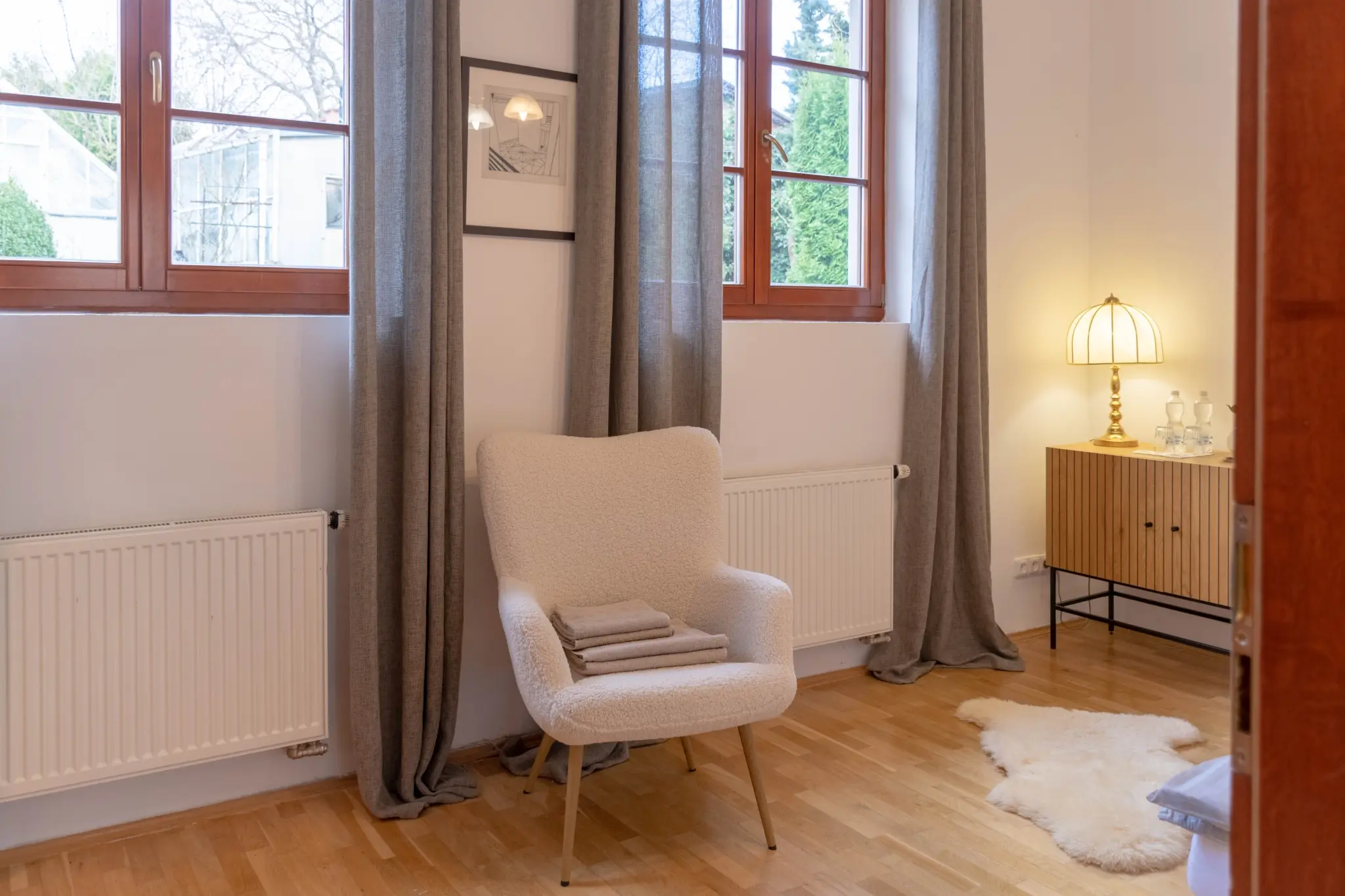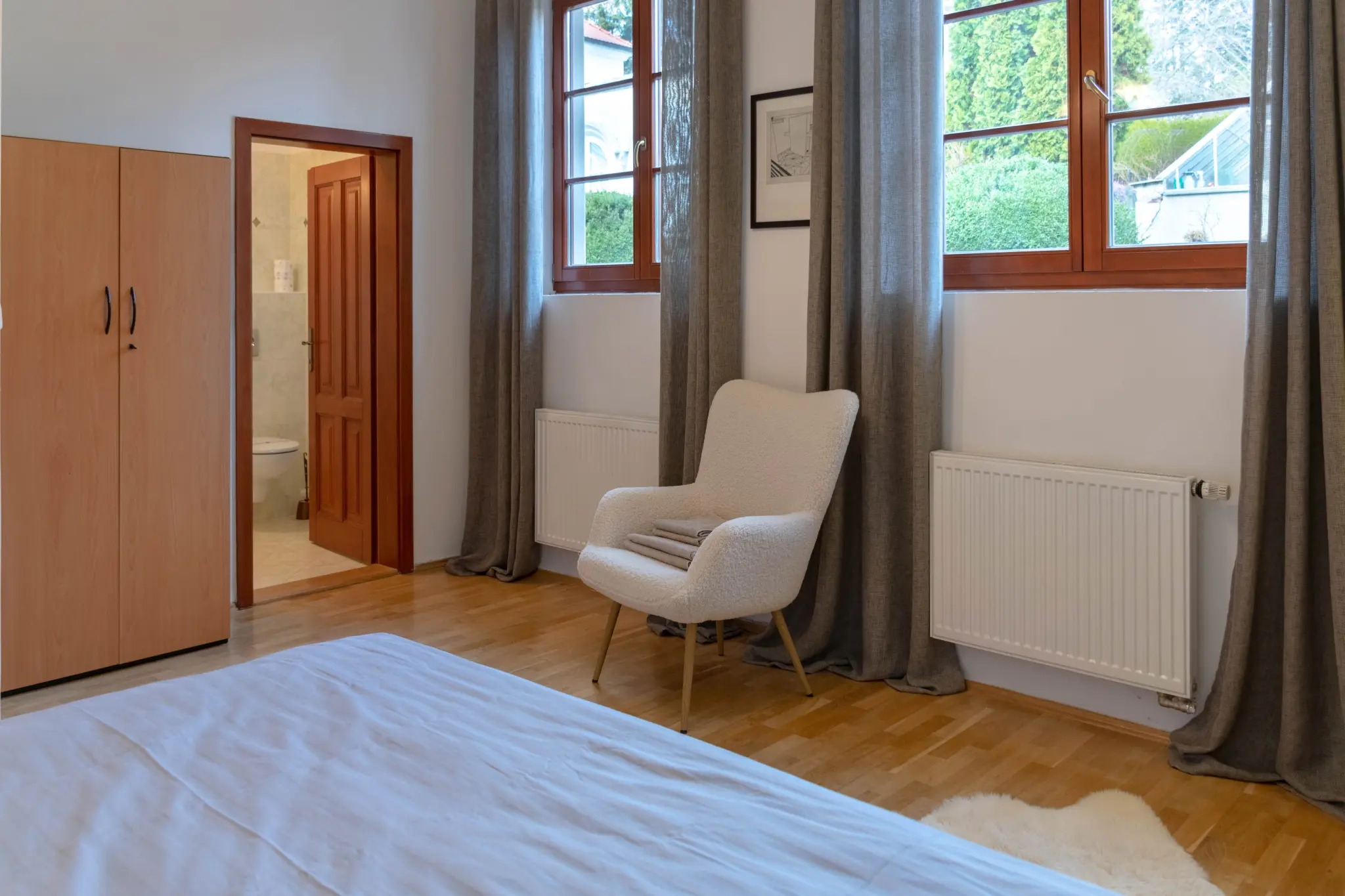 Moderně zařízený pokoj nabízí flexibilní uspořádání lůžek – manželskou postel lze jednoduše rozdělit na dvě samostatná lůžka. Stylový interiér doplňuje designové křeslo a elegantní nábytek. Pokoj je ideální jak pro páry, tak pro přátele cestující společně. Koupelna s vanou zajišťuje pohodlný relax během pobytu.